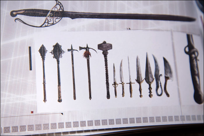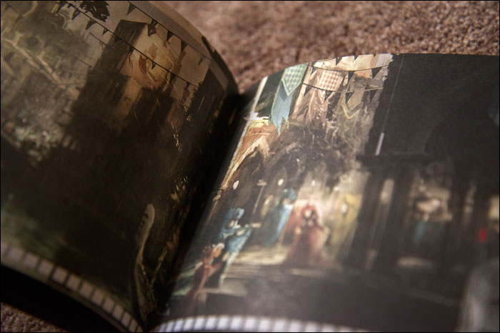 Then there is a small but nice art book. The drawings it contains are beautiful as is to be expected, especially those of the various picturesque environments. What is also cool about this book is not only that it’s hardcover, but that it’s coated in some kind of rubber, with the logo of the game engraved in.