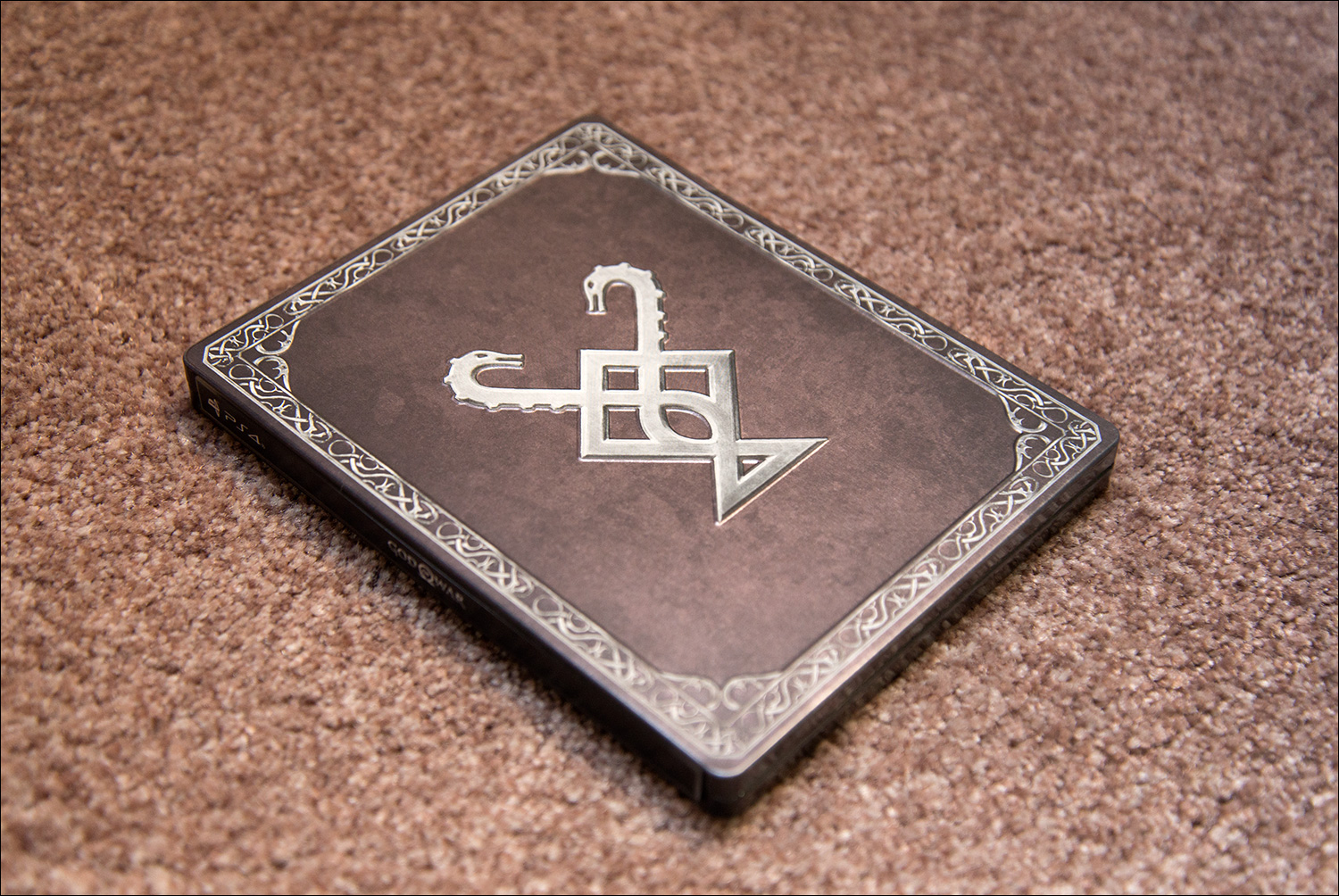 Inside are two items: a steelbook and an artbook. First, let’s take a look at the steelbook. On the front is a Nordic rune Othala, or Odal. It represents the ‘o’ sound, much like the Omega-symbol that God of War has used since the beginning. In the game, this is the brand of the dwarven brothers that help you on your journey. On the back of the case are more runes.