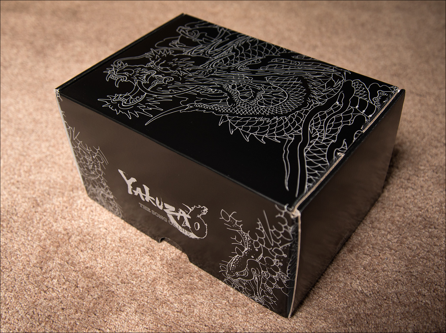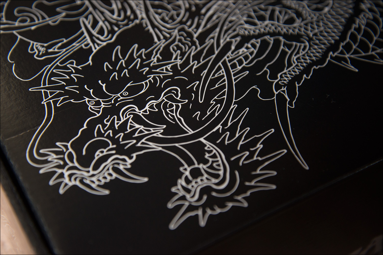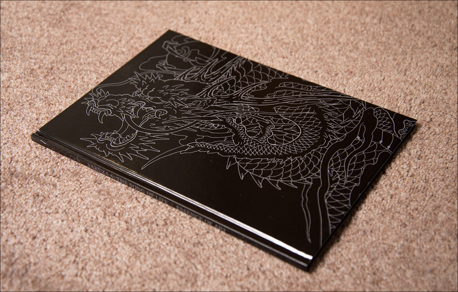 With the dust cover removed, you are left with a black box decorated with a yakuza-style dragon in fine grey lines.